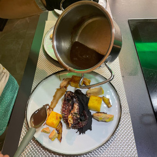 Bei Bedarf kann die Jus noch mit etwas Nero di Sepia geschwärzt werden. So wirkt die Jus als wäre sie die Tinte des Pulpos.