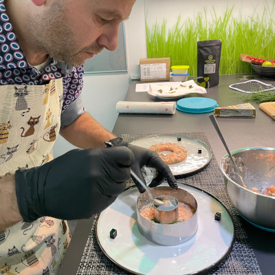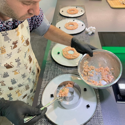 Zum Anrichten das Tatar in einem Kreis-Ring auf dem Teller ca.1cm dick auftragen.